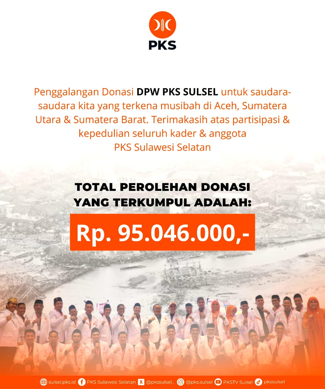 Karena itu DPW PKS Sulawesi Selatan melibatkan diri dalam perbuatan mulia tersebut, dan sekaligus menyampaikan apresiasi dan terima kasih yang sebesar-besarnya kepada seluruh kader dan anggota yang telah memberikan donasi untuk membantu korban bencana di Aceh dan Sumatera.
