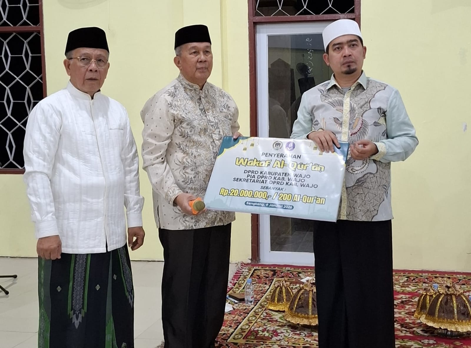 Pada kesempatan yang sama, DPRD Wajo melalui Anggota DPRD, PIA, dan Sekretariat DPRD mewakafkan 200 mushaf Al-Qur’an senilai Rp20 juta. Wakaf tersebut diserahkan langsung oleh Ketua DPRD Wajo, Ir H Firmansyah Perkesi, MSi, dan diterima oleh Ustadz Solmed sebagai bentuk kepedulian DPRD Wajo dalam memperkuat nilai-nilai keagamaan di tengah masyarakat. (Hakim)