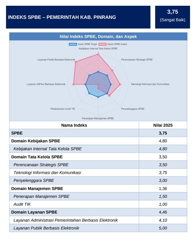 Peningkatan indeks SPBE diharapkan menjadi dorongan bagi Pemerintah Kabupaten Pinrang untuk terus menghadirkan tata kelola pemerintahan yang adaptif terhadap perkembangan teknologi, sekaligus memastikan pelayanan publik yang lebih berkualitas, mudah, dan berpihak kepada kepentingan masyarakat. (yd)