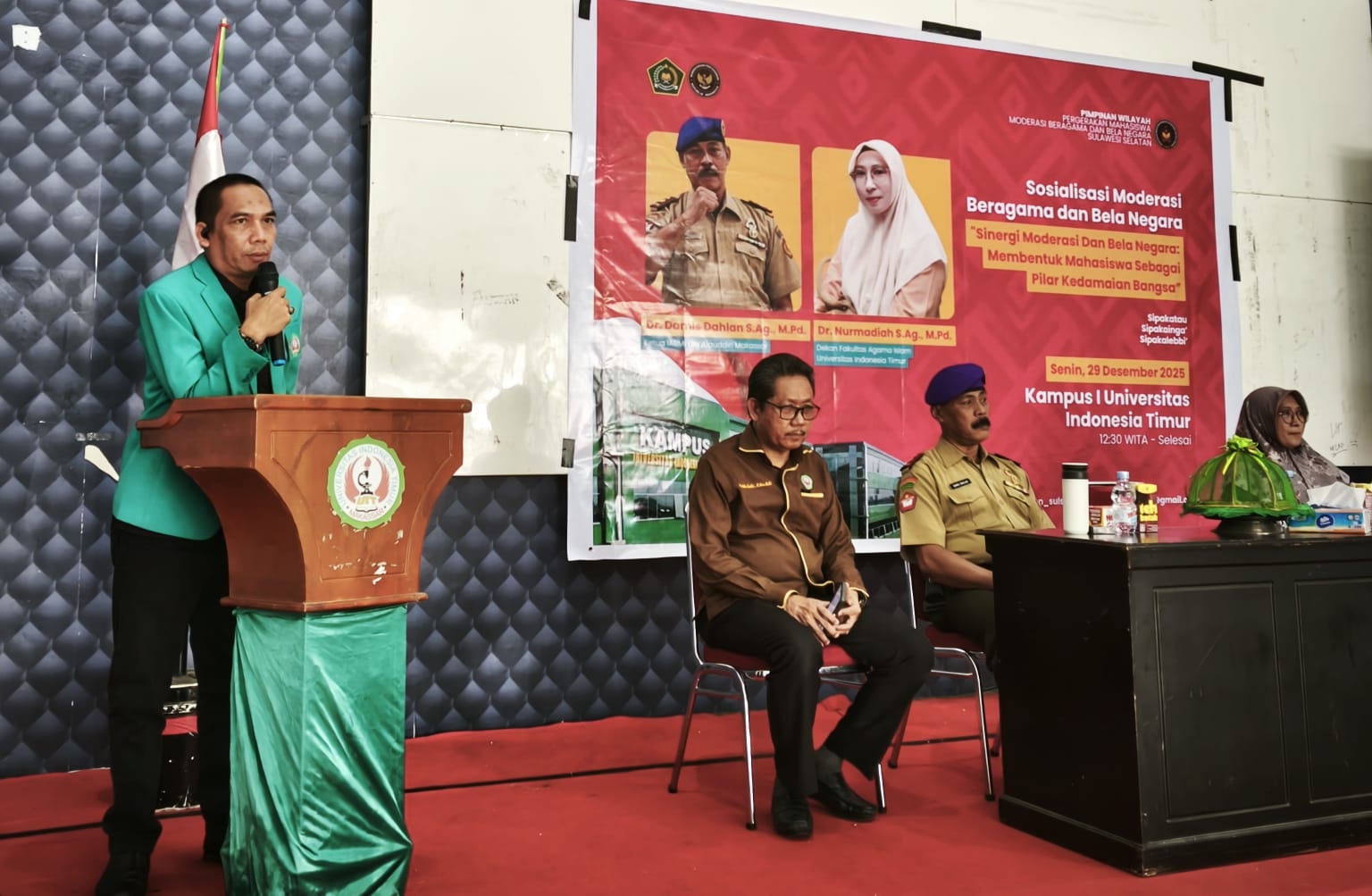 Makassar, makassarpena.id – Pergerakan Mahasiswa Moderasi Beragama dan Bela Negara (PMMBN) Sulawesi Selatan Adakan Sosialisasi Moderasi Beragama dan Bela Negara di Kampus I UIT Aula Konsentrasi, Senin 29 Desember 2025, mengusung tema “Sinergi Moderasi dan Bela Negara : Membentuk Mahasiswa sebagai Pilar Kedamaian Bangsa”.