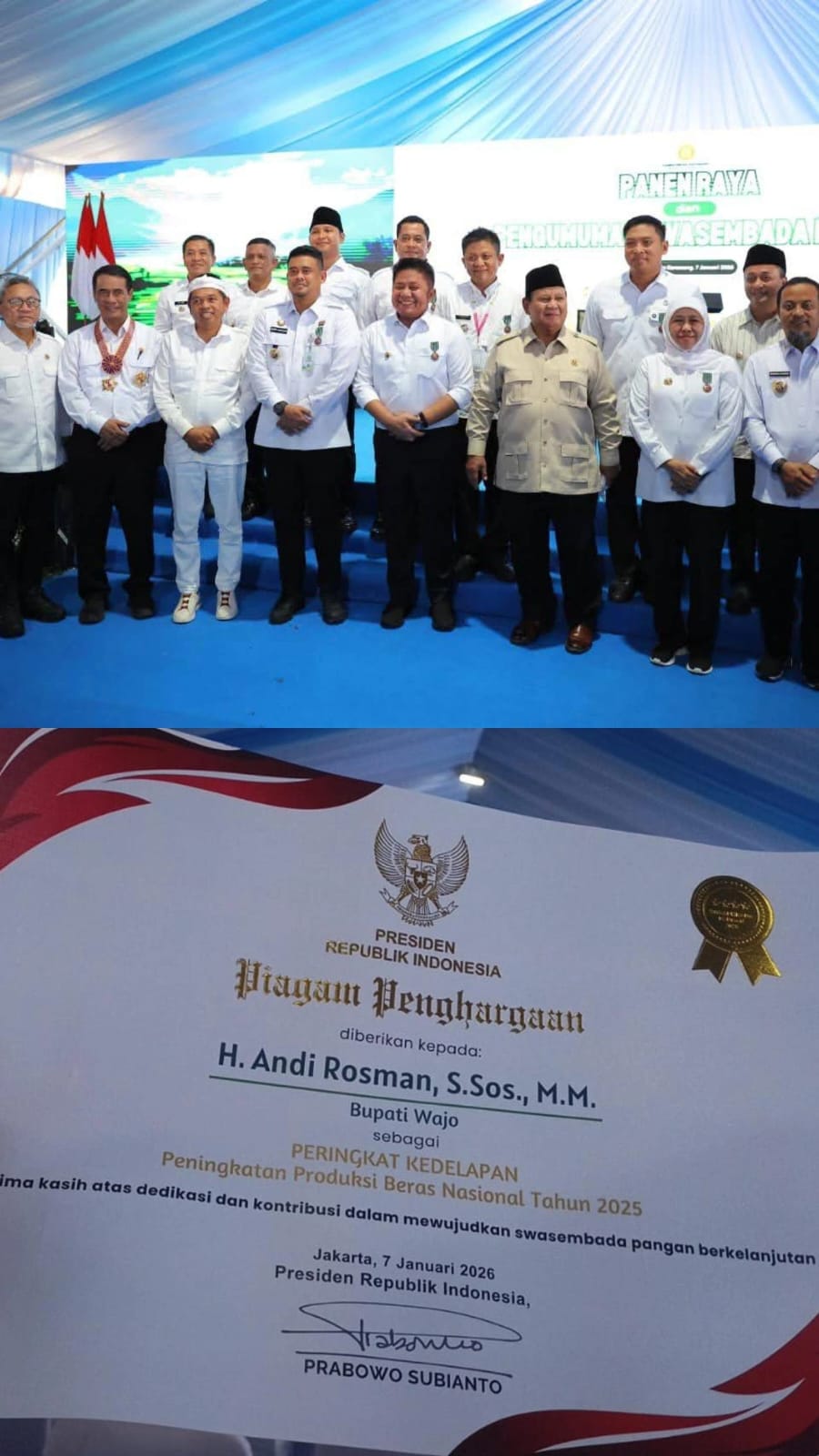 “Alhamdulillah, Kabupaten Wajo mendapatkan penghargaan dari Bapak Presiden RI dalam bidang swasembada pangan, peringkat ke-8 peningkatan produksi beras nasional tahun 2025. Penghargaan ini ditandatangani langsung oleh Bapak Presiden RI,” ujarnya.